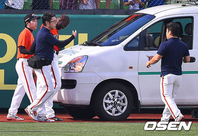 5일 오후 대구구장에서 열린 '2014 한국야쿠르트 세븐 프로야구' 삼성 라이온스와 한화 이글스의 경기,1회말 1사 삼성 박한이의 안타성 타구를 한화 피에가 호수비 펼쳤다. 수비 동작에서 어깨를 부딪힌 피에가 교체되고 있다.
