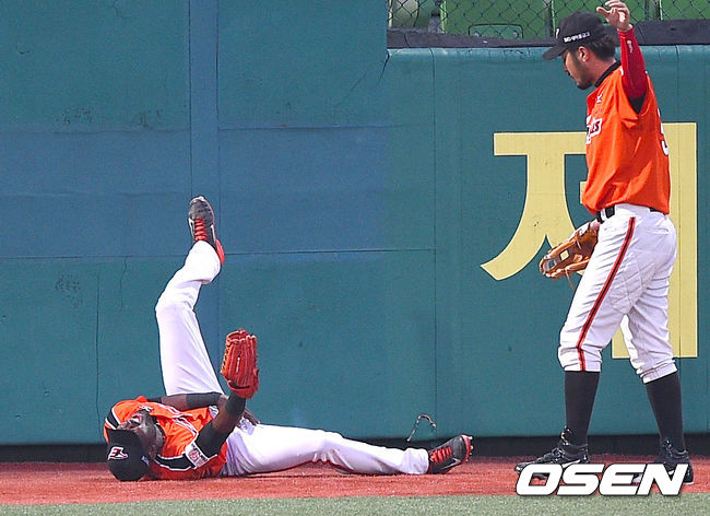 5일 오후 대구구장에서 열린 '2014 한국야쿠르트 세븐 프로야구' 삼성 라이온스와 한화 이글스의 경기,1회말 1사 삼성 박한이의 안타성 타구를 한화 피에가 호수비 펼쳤다. 수비 동작에서 어깨를 부딪힌 피에가 고통스러워하고 있다.