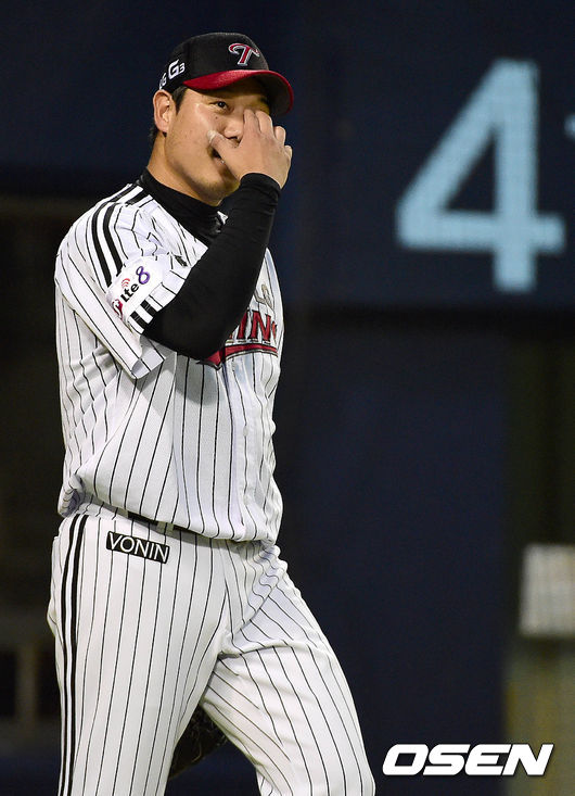 3회초 두산 공격 2사 1루 상황 홍성흔에게 오른쪽 2루타를 허용한 LG 투수 류제국이 아쉬워하고 있다.