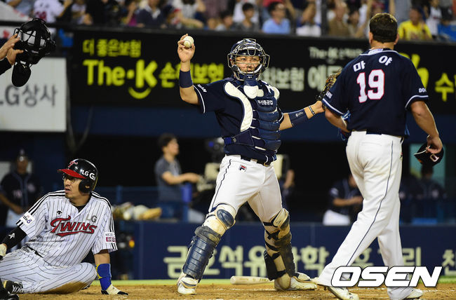 3회말 LG 공격 1사 1루 상황 박경수의 좌익선상 2루타 때 홈으로 쇄도한 주자 정성훈이 두산 포수 양의지의 태그에 걸려 아웃됐다. 선발 마야를 바라보는 두산 포수 양의지.