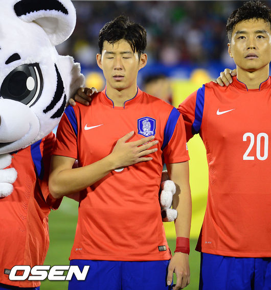5일 오후 경기 부천종합운동장에서 열린 대한민국과 베네수엘라의 평가전, 손흥민이 애국가를 따라부르고 있다.