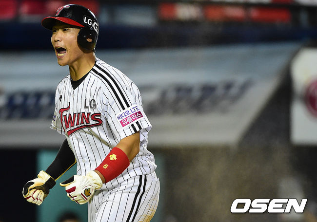 5회말 LG 공격 1사 1, 3루 상황 이병규의 우익수 1타점 희생플라이 때 홈으로 태그업해 두산 포수 양의지의 태그보다 앞서 세이프된 뒤 환호하고 있다.