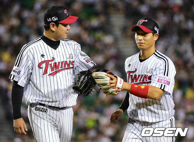 6회초 두산 공격을 삼자범퇴로 막아낸 LG 선발 류제국이 2루수 박경수와 인사를 나누며 더그아웃으로 들어오고 있다.