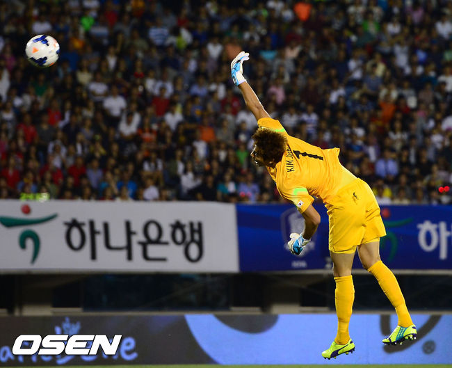 5일 오후 경기 부천종합운동장에서 열린 대한민국과 베네수엘라의 평가전, 전반 한국 김진현 골키퍼가 베네수엘라 마리오 론돈에게 선제골을 허용하고 있다. 마리오 론돈은 김진현 골키퍼가 찬 볼을 받아 그대로 중거리슛을 날렸다.