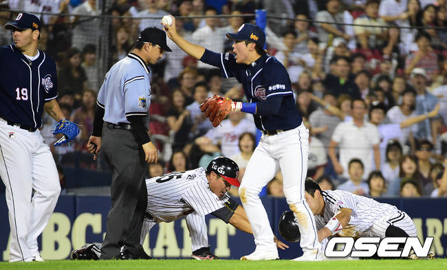 6회말 LG 공격 1사 1루 상황 손주인의 중전 안타 때 3루까지 내달린 주자 최경철이 3루에서 세이프 됐다. 이 상황에서 두산 선발 마야와 3루수 허경민이 더그아웃을 향해 합의판정을 요청하고 있다. 결과는 처음 판정 그대로 세이프 판정.