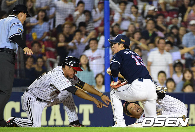 6회말 LG 공격 1사 1루 상황 손주인의 중전 안타 때 3루까지 내달린 주자 최경철이 3루에서 세이프되고 있다. 이 상황에서 두산은 합의판정을 요청했고 결과는 처음 판정 그대로 세이프 선언.