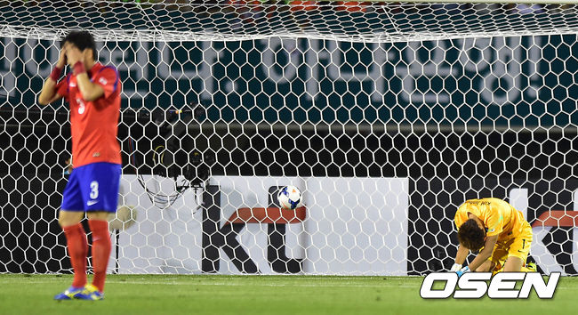 전반 한국 골키퍼 김진현이 실책으로 베네수엘라에 골을 허용하고 아쉬운 표정을 짓고 있다.