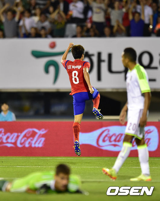 전반 한국 이명주가 골을 성공시키고 환호하고 있다.