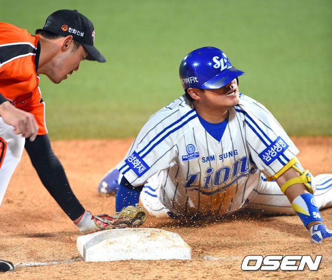 5일 오후 대구구장에서 열린 '2014 한국야쿠르트 세븐 프로야구' 삼성 라이온스와 한화 이글스의 경기,6회말 1사 삼성 이지영이 3루타를 날리고 3루에 세이프되고 있다.