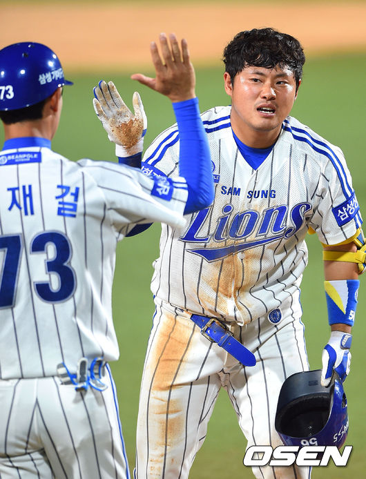 5일 오후 대구구장에서 열린 '2014 한국야쿠르트 세븐 프로야구' 삼성 라이온스와 한화 이글스의 경기,6회말 1사 삼성 이지영이 3루타를 날린뒤 김재걸 코치와 하이파이브를 하고 있다.