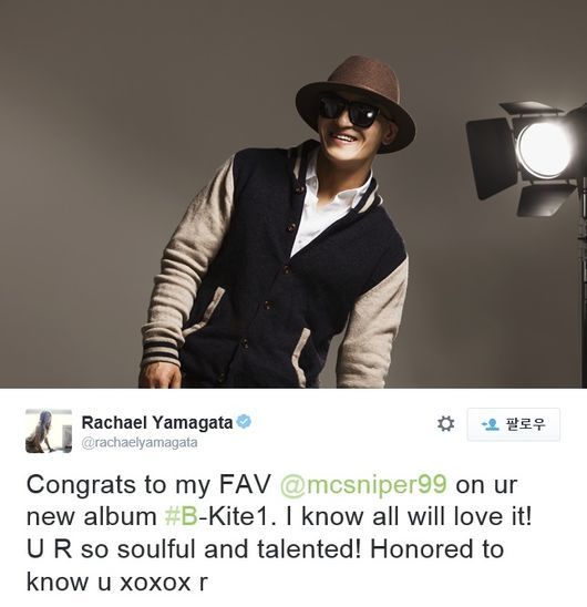 레이첼 야마가타는 5일 오후 자신의 SNS에 “내가 가장 좋아하는 MC스나이퍼의 새 앨범 ‘비카이트 원(B-Kite 1)’ 발매를 축하한다. 나는 모두가 이 앨범을 좋아할 것이라고 생각한다”는 글을 올렸다. 이어 “MC스나이퍼는 매우 소울풀하고 재능 있는 사람”이라고 덧붙이며 애정을 드러냈다.