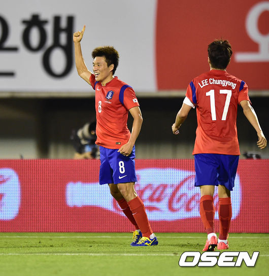 전반 한국 이명주가 골을 성공시키고 환호하고 있다.