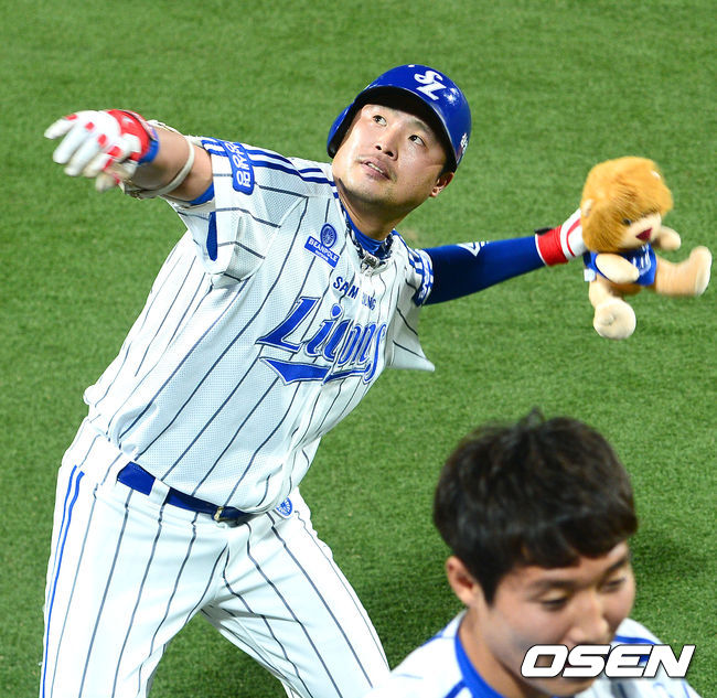5일 오후 대구구장에서 열린 '2014 한국야쿠르트 세븐 프로야구' 삼성 라이온스와 한화 이글스의 경기,7회말 1사 삼성 박한이가 솔로 홈런을 날리고 팬들에 인형을 던져주고 있다
