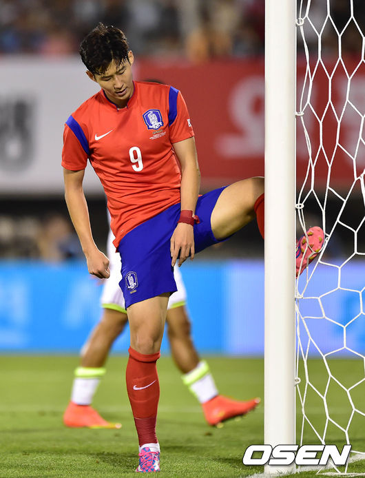 전반 슛에 실패한 한국 손흥민이 골대에 불만을 표출하고 있다.