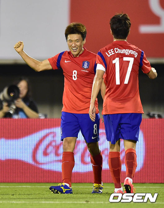 전반 한국 이명주가 골을 성공시키고 환호하고 있다.