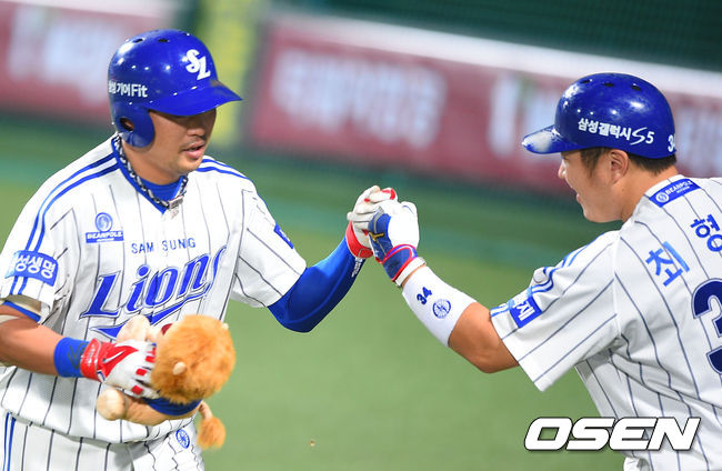 5일 오후 대구구장에서 열린 '2014 한국야쿠르트 세븐 프로야구' 삼성 라이온스와 한화 이글스의 경기, 7회말 1사 삼성 박한이가 솔로홈런을 날린후 최형우와 하이파이브를 하고 있다