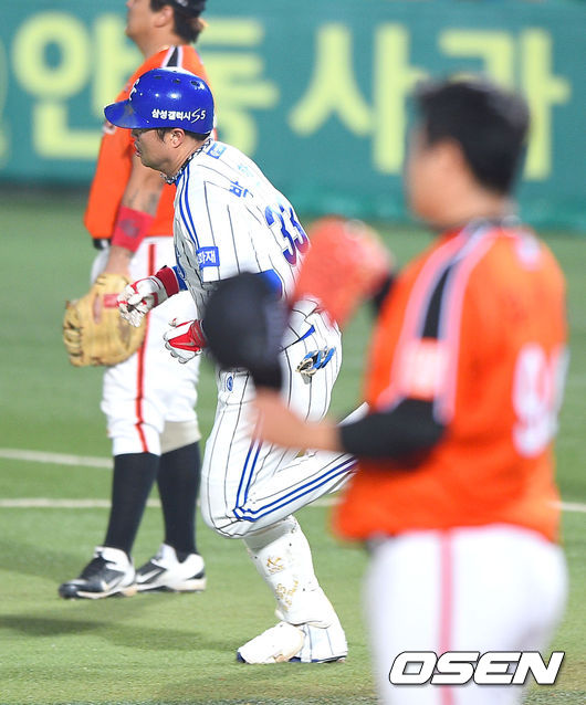 5일 오후 대구구장에서 열린 '2014 한국야쿠르트 세븐 프로야구' 삼성 라이온스와 한화 이글스의 경기, 7회말 1사 삼성 박한이가 솔로홈런을 날리고 베이스를 돌고 있다