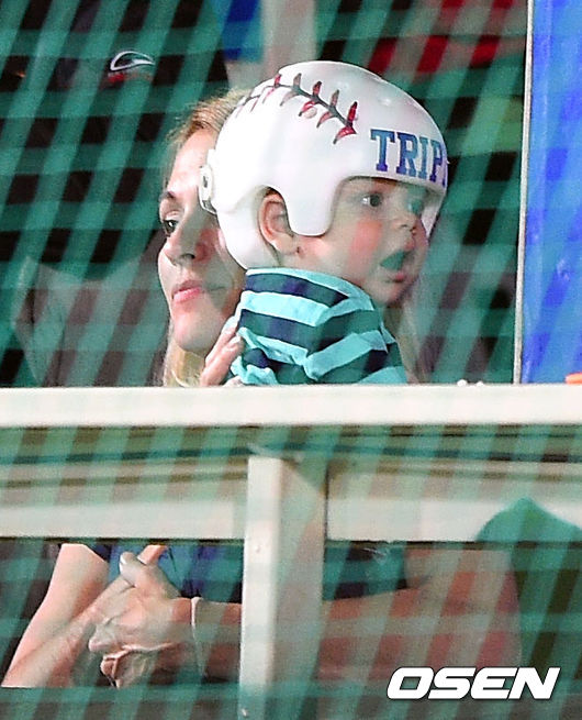 5일 오후 대구구장에서 열린 '2014 한국야쿠르트 세븐 프로야구' 삼성 라이온스와 한화 이글스의 경기, 삼성 마틴 아내 애린과 아들이 경기를 관전하고 있다.