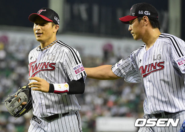 8회초 두산 공격 2사 주자없는 상황 양의지의 뜬 공 타구를 멋지게 잡아낸 LG 중견수 임재철이 투수 이동현과 인사를 나누며 더그아웃으로 들어오고 있다.