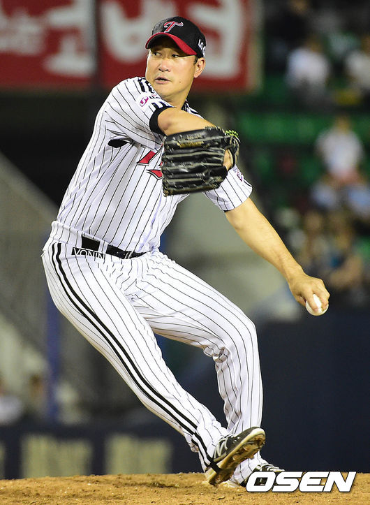 9회초 두산 공격 때 마운드에 오른 LG 투수 봉중근이 힘차게 공을 뿌리고 있다.