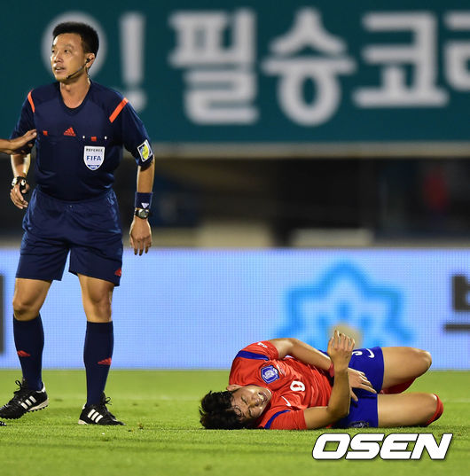 전반 상대 문전에서 수비와 충돌한 한국 손흥민이 고통스러워하고 있다.