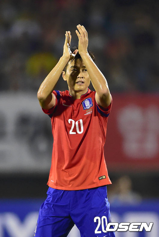 후반 한국 이동국이 이근호와 교체되며 관중석을 향해 인사를 하고 있다.