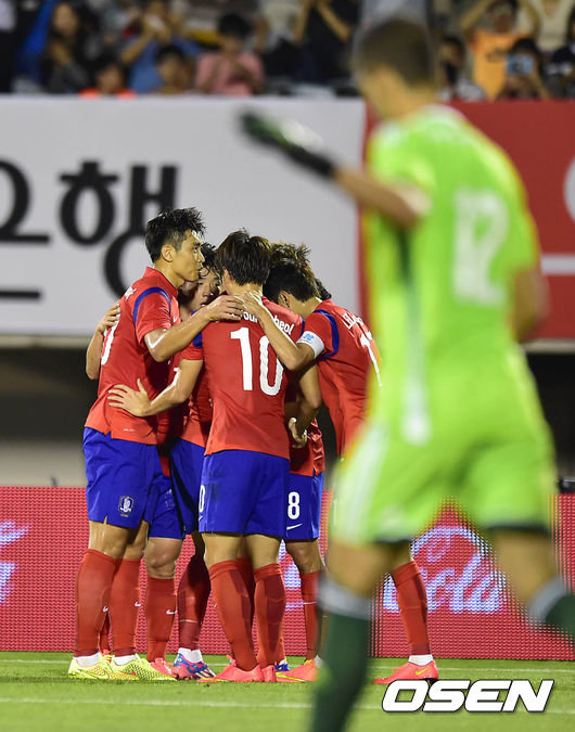 전반 한국 이명주가 골을 성공시키고 동료들과 환호하고 있다.