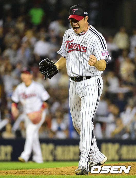 9회초 두산 공격 2사 2루 상황 대타 오재일을 삼진으로 이끌며 경기를 마무리지은 LG 투수 봉중근이 환호하고 있다./dreamer@osen.co.kr