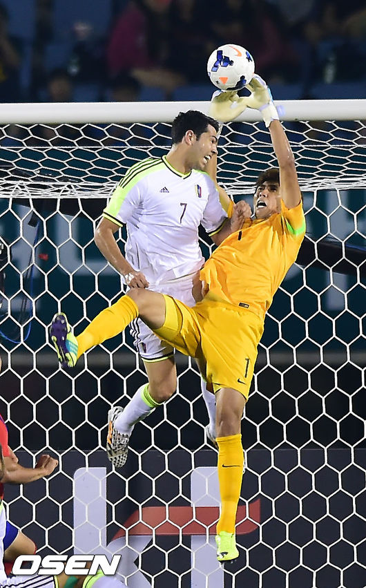 5일 오후 경기 부천종합운동장에서 열린 대한민국과 베네수엘라의 평가전, 후반 니콜라스 페도르와 김진현 골키퍼가 충돌하고 있다.