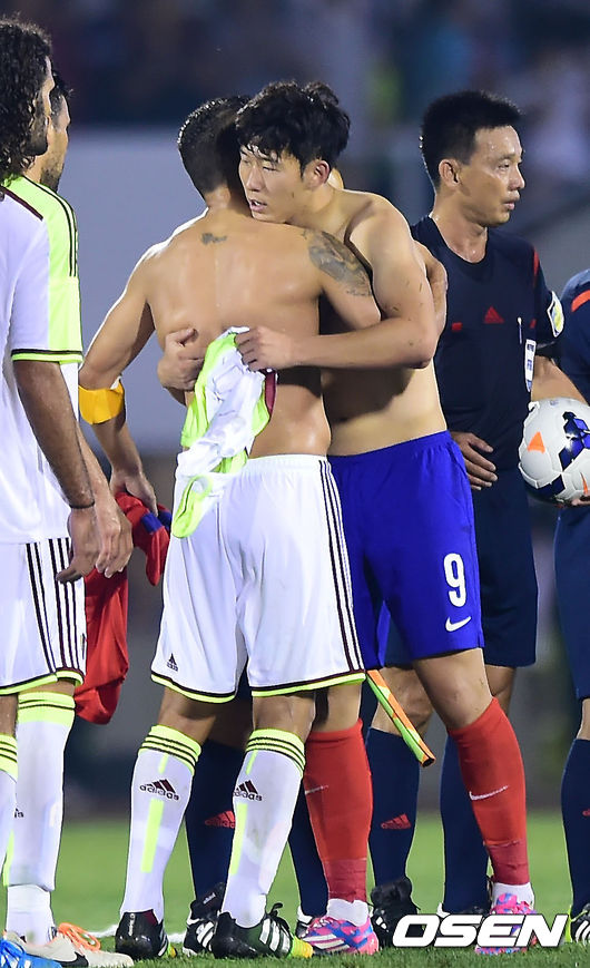 경기를 마치고 손흥민이 함부르크 시절 동료인 베네수엘라의 토마스 링콘과 유니폼을 교환하며 포옹을 하고 있다. / rumi@osen.co.kr