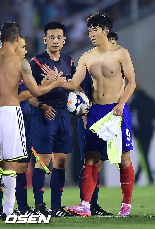 경기를 마치고 손흥민이 함부르크 시절 동료인 베네수엘라의 토마스 링콘과 유니폼을 교환하고 있다. / rumi@osen.co.kr