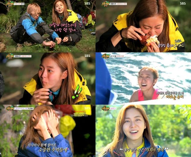 유이는 빼는 법이 없었으며 '털털함의 극치'를 달렸다 . 수영이 특기인 유이는 남자 멤버들과 함께 바다에 들어가 직접 사냥을 했다. 또 그는 얼굴에 숯검댕을 묻히고도 "예쁘다"며 웃어보였다. 여자 연예인으로서 드러내기 힘든 민낯도 유이라면 당당했다. 그는 이른 아침 기상 후 카메라에 부은 얼굴을 보이면서도 가리는 일이 없었다. 물론 가리지 않아도 아름다운 유이였다.