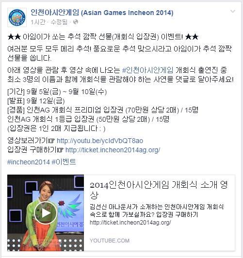 국문 페이스북(https://www.facebook.com/IncheonAG2014)에서 참여할 수 있고 개회식 소개 영상에 대한 퀴즈 정답과 관람해야 하는 사연을 올리면 된다. 프로모션은 10일까지 시행되며 약 300만 명 이상에게 노출될 것으로 예상된다.