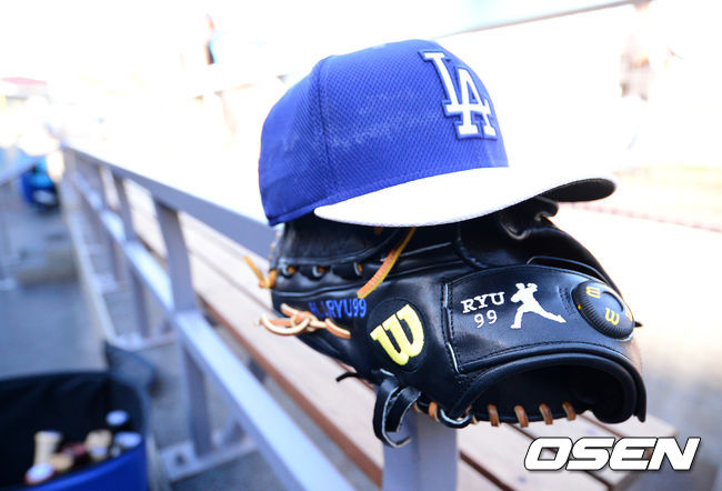 더그아웃에 놓여져 있는 류현진 글러브와 모자.