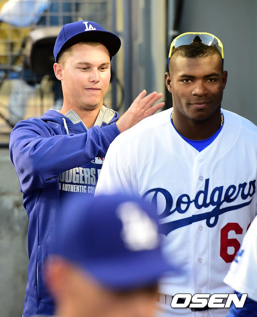 경기에 앞서 다저스 피더슨과 푸이그가 서로를 격려하고 있다.