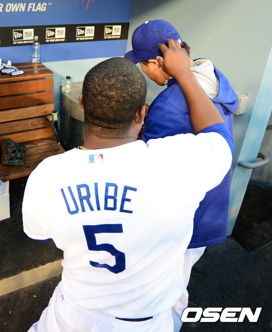 경기에 앞서 다저스 류현진과 유리베가 더그아웃에서 장난을 치고 있다.
