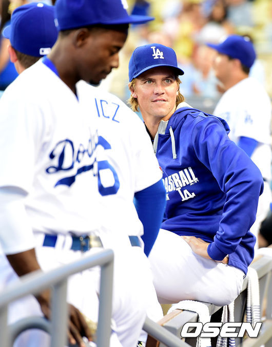 경기에 앞서 다저스 그레인키가 더그아웃에서 관중석을 바라보고 있다.