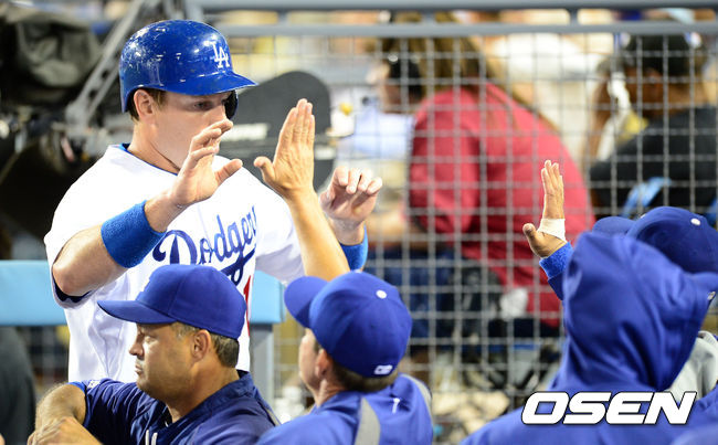 2회말 2사 1,2루에서 다저스 라미레즈의 선제 1타점 우전 적시타에 엘리스가 홈을 밟고 더그아웃에서 동료선수들과 하이파이브를 하고 있다.