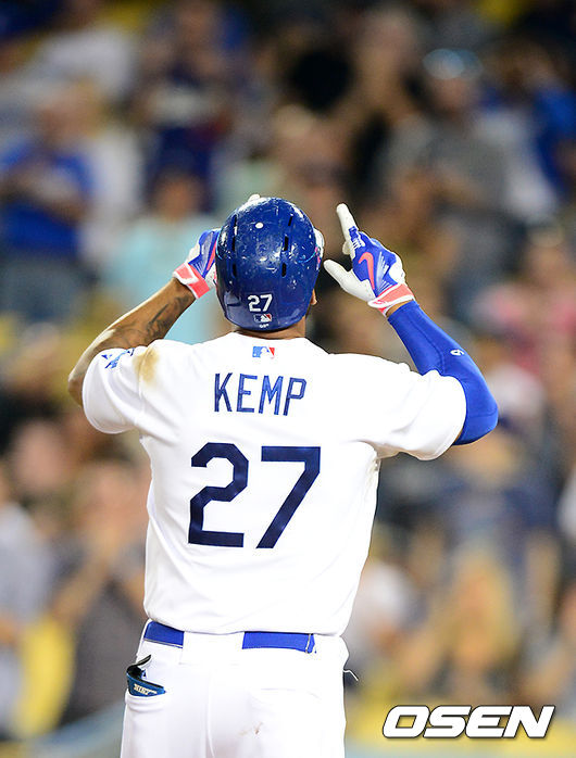 3회말 무사에서 다저스 맷 켐프가 솔로포를 날리고 홈을 밟으며 세리머니를 하고 있다.