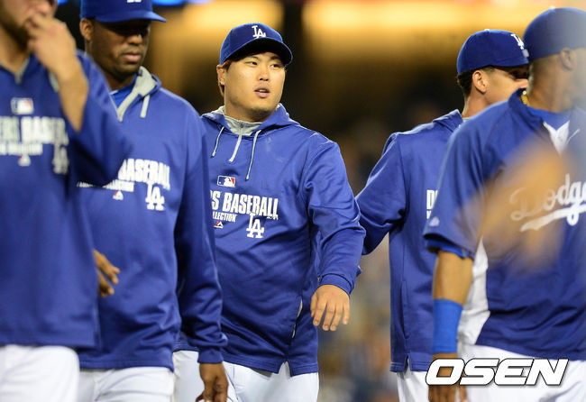 경기후 다저스 류현진이 동료 선수들과 승리 하이파이브를 한 뒤 그라운드를 나서고 있다. / jpnews@osen.co.kr