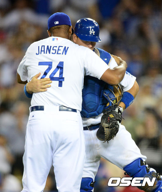 경기후 다저스 잰슨이 엘리스와 포옹을 하고 있다. / jpnews@osen.co.kr