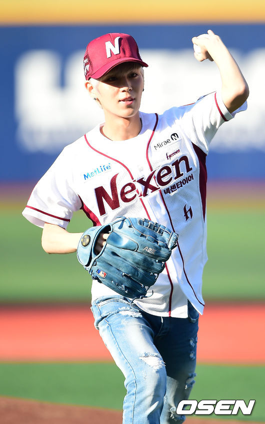 6일 오후 서울 목동구장에서 열린 '2014 한국야쿠르트 세븐 프로야구' 넥센 히어로즈와 롯데 자이언츠 경기, 경기 전 '소년공화국' 수웅이 승리 기원 시구를 펼치고 있다.