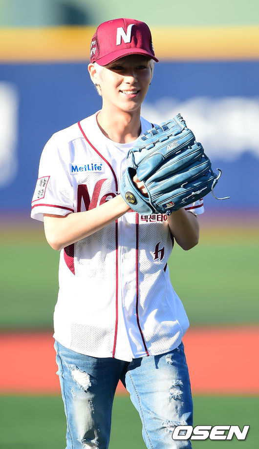 6일 오후 서울 목동구장에서 열린 '2014 한국야쿠르트 세븐 프로야구' 넥센 히어로즈와 롯데 자이언츠 경기, 경기 전 '소년공화국' 수웅이 승리 기원 시구를 펼치고 있다.