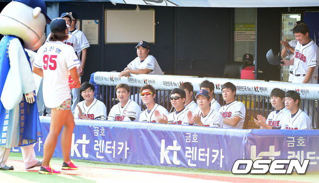 시구자로 나선 프로골퍼 고진영이 경기장을 나서며 두산 더그아웃 선수들의 박수를 받고 있다.