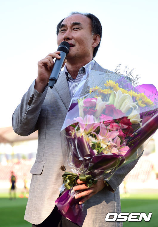 6일 오후 성남 탄천종합운동장에서 열린 '현대오일뱅크 K리그 클래식' 성남 FC와 인천 유나이티드의 경기에 앞서 성남 FC 김학범 감독이 인사말을 하고 있다.