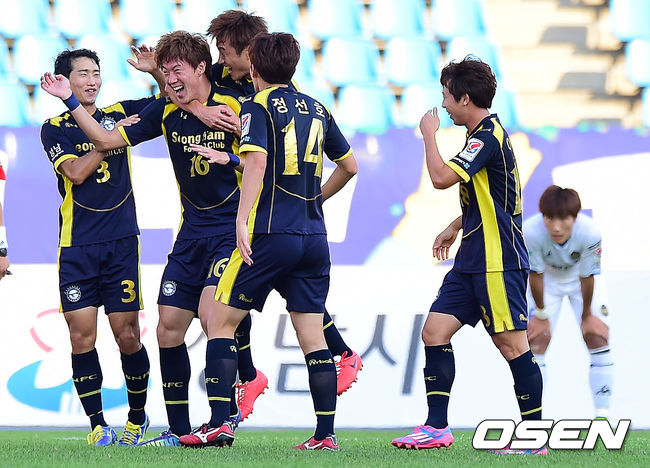 6일 오후 성남 탄천종합운동장에서 열린 '현대오일뱅크 K리그 클래식' 성남 FC와 인천 유나이티드의 경기 전반 성남 황의조가 선취골을 넣은 뒤 동료들의 축하를 받고 있다.