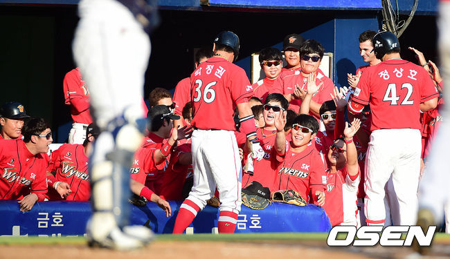 2회초 SK 공격 2사 만루 상황 정상호가 선제 좌월 만루홈런을 날리고 홈을 밟은 뒤 더그아웃 동료들과 인사를 나누고 있다.