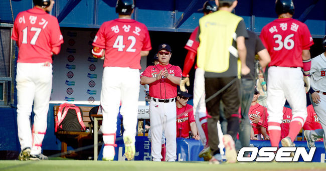 2회초 SK 공격 2사 만루 상황 정상호가 선제 좌월 만루홈런을 날리고 홈을 밟은 뒤 이만수 감독의 환영을 받고 있다.