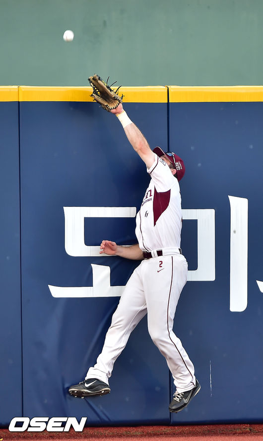 6일 오후 서울 목동구장에서 열린 '2014 한국야쿠르트 세븐 프로야구' 넥센 히어로즈와 롯데 자이언츠 경기, 3회초 무사 주자 1루 롯데 손아섭이 좌월 투런 홈런 타구를 넥센 좌익수 로티노가 뛰어올랐지만 잡아내지 못하고 있다.