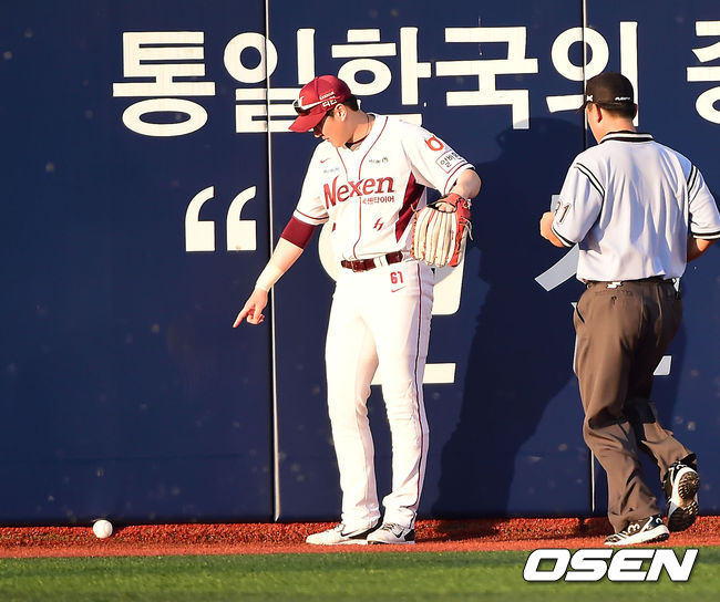 6일 오후 서울 목동구장에서 열린 '2014 한국야쿠르트 세븐 프로야구' 넥센 히어로즈와 롯데 자이언츠 경기, 3회초 2사 주자 만루 롯데 정훈의 타구가 중월 아래에 박혀서 넥센 중견수 유한준이 어필을 하고 있다.